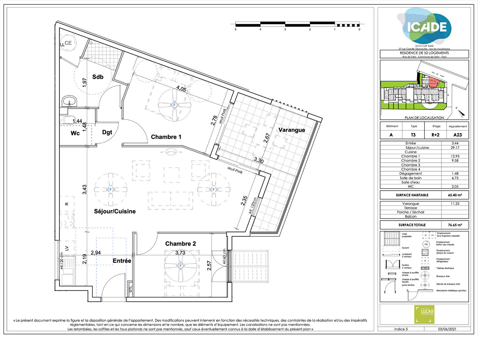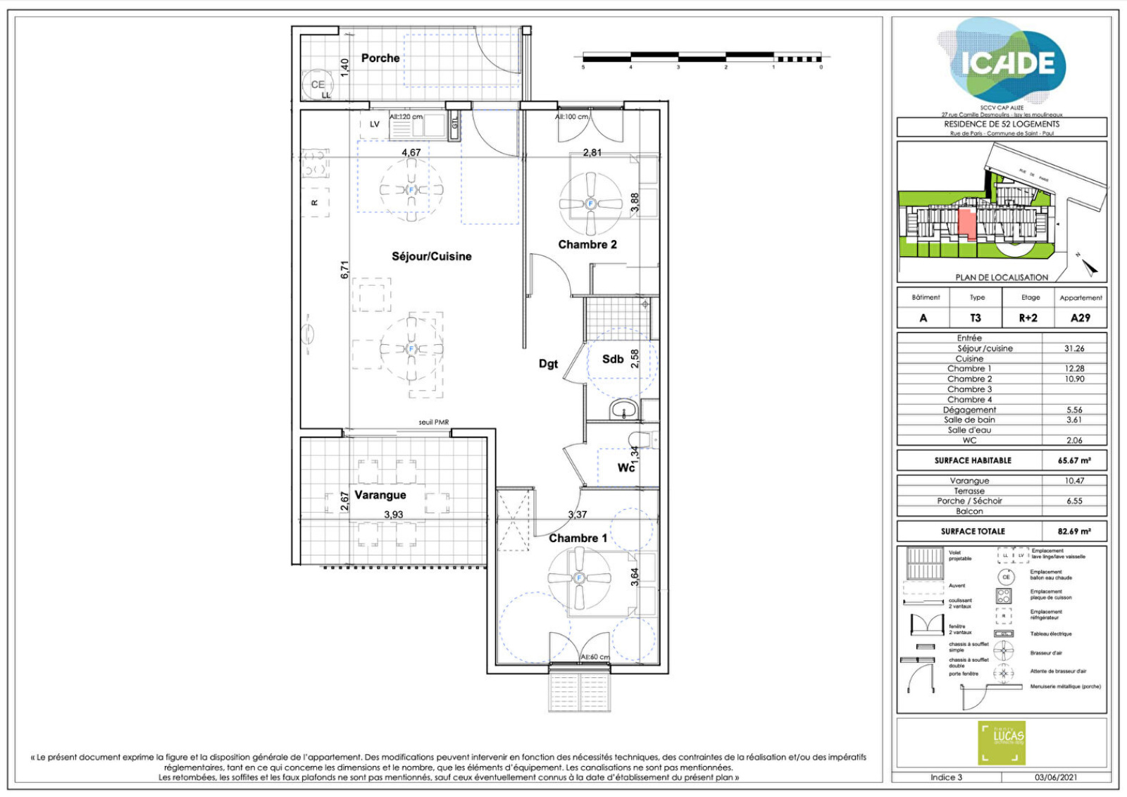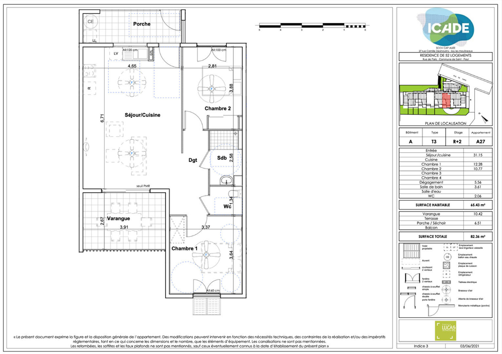 Plusieurs appartements avec vue sur mer de type T3 sont disponibles à la vente dans la Résidence Cap Alizé à Saint-Paul, cette résidence possèdera 56 logements en copropriété. Sur quatres étages. Desservi d'un ascenseur passant par tout les étages. Elle possèdera un parking collectif en sous-sol, chaque appartement possèdera un numéro de place attribué, elle sera également fermée par un portail. La résidence sera également équipée de panneaux solaires. Vous serez proche de la gare routière, école, supermarché, centre-ville,200m du marché de Saint-Paul et piscine du front de mer. 10 apprtements de type T3 sont disponibles à partir de 313 000€ à 342 000€. Au premier étage 3 apprtements à partir de 318 000€ à 342 000€ : - Lot n°A17 : T3 situé à R+1 d'une surface habitable de 65.53m2, disposant d'une cuisne ouverte sur le séjour de 31.26m2, d'une salle de bain de 3.61m2, d'un WC de 2.06m2, d'une première chambre de 12.27m2 et d'une seconde chambre de 10.77m2. Pour l'extérieur vous pourrez y retrouver une varangue de 10.47m2 et un porshe de 6.55m2. Les 2 chambres seront équipées de brasseur d'air et 2 attentes pour le séjour. Au prix de 318 000€ TTC, les honoraires sont à charge du vendeur. - Lot n°A16 : T3 situé à R+1 d'une surface habitable de 65.80m2, dispoasant d'une cuisine ouverte sur le séjour de 31.26m2, d'une salle de bain de 3.61m2, d'un WC de 2.06m2, d'une première chambre de 12.41m2 et d'une seconde de 10.90m2. Pour l'extérieur vous pourrez y retrouver une varangue de 10.47m2 et un porshe de 6.55m2. Les 2 chambres seront équipées de brasseur d'air et 2 attentes pour le séjour. Au prix de 318 000€ TTC, les honoraires sont à charge du vendeur. - Lot n°A20 : T3 situé à R+1 d'une surface habitable de 76.18m2, disposant d'une cuise ouverte sur le séjour de 41.78m2, d'une salle de bain de 5.00m2, d'un WC de 1.46m2, d'une première chambre de 13.71m2 et d'une seconde de 10.69m2. Pour l'extérieur vous pourrez y retrouver une varangue de 11.60m2 et un porshe de 3.07m2. Les 2 chambres seront équipées de brasseur d'air et 2 attentes pour le séjour. Au prix de 342 000€ TTC, les honoraires sont à charge du vendeur. Au deuxième étage 5 apprtements à partir de 313 000€ à 322 000€ : - Lot n°A27 : T3 situé à R+2 d'une surface habitable de 65.43m2, disposant d'une ouverte sur le séjour de 31.15m2, d'une salle de bain de 3.61m2, d'un WC de 2.06m2, d'une première chambre de 12.28m2 et d'une seconde chambre de 10.77m2. Pour l'extérieur vous pourrez y retrouver une varangue de 10.42m2 et un porshe de 6.51m2. Les 2 chambres seront équipées de brasseur d'air et 2 attentes pour le séjour. Au prix de 321 000€ TTC, les honoraires sont à charge du vendeur. - Lot n°A28 : T3 situé à R+2 d'une surface habitable de 65.43m2, disposant d'une ouverte sur le séjour de 31.15m2, d'une salle de bain de 3.61m2, d'un WC de 2.06m2, d'une première chambre de 12.28m2 et d'une seconde chambre de 10.77m2. Pour l'extérieur vous pourrez y retrouver une varangue de 10.42m2 et un porshe de 6.50m2. Les 2 chambres seront équipées de brasseur d'air et 2 attentes pour le séjour. Au prix de 321 000€ TTC, les honoraires sont à charge du vendeur. - Lot n°A30 : T3 situé à R+2 d'une surface habitable de 65.54m2, disposant d'une cuisine ouverte sur le séjour de 31.26m2, d'une salle de bain de 3.61m2, d'un WC de 2.06m2, d'une première chambre de 12.28m2 et d'une seconde chambre de 10.77m2. Pour l'extérieur vous pourrez y retrouver une varangue de 10.47m2 et un porshe de 6.55m2. Les 2 chambres seront équipées de brasseur d'air et 2 attentes pour le séjour. Au prix de 322 000€ TTC, les honoraires sont à charge du vendeur. - Lot n°A29 : T3 situé à R+2 d'une surface habitable de 65.67m2, disposant d'une cuisine ouverte sur le séjour de 31.26m2, d'une salle de bain de 3.61m2, d'un WC de 2.06m2, d'une première chambre de 12.28m2 et d'une seconde chambre de 10.90m2. Pour l'extérieur vous pourrez y retrouver une varangue de 10.47m2 et un porshe de 6.55m2. Les 2 chambres seront équipées de brasseur d'air et 2 attentes pour le séjour. Au prix de 322 000€ TTC, les honoraires sont à charge du vendeur. - Lot n°A23 : T3 situé à R+2 d'une surface habitable de 65.40m2, disposant d'une cuisine ouverte sur le séjour de 29.17m2, d'une salle de bain de 6.75m2, d'un WC de 2.05m2, d'une première chambre de 12.93m2 et d'une seconde chambre de 9.58m2. Pour l'extérieur vous pourrez y retrouver une varangue de 11.25m2. Les 2 chambres seront équipées de brasseur d'air et 2 attentes pour le séjour. Au prix de 313 000€ TTC, les honoraires sont à charge du vendeur. Au troisième étage 2 appartements au prix de 326 000€ : - Lot n°A39 : T3 situé à R+3 d'une surface habitable de 65.43m2, disposant d'une cuisine ouverte sur le séjour de 31.15m2, d'une salle de bain de 3.61m2, d'un WC de 2.06m2, d'une première chambre de 12.28m2 et d'une seconde chambre de 10.77m2. Pour l'extérieur vous pourrez y retrouver une varangue de 10.42m2 et un porshe de 6.50m2. Les 2 chambr